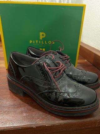 Mocasines de charol con cordones. - Diseño clásico con picado. - Suela gruesa con detalle de ribete. Son súper cómodos. Marca española de calidad.