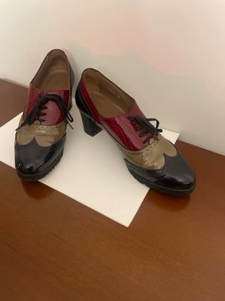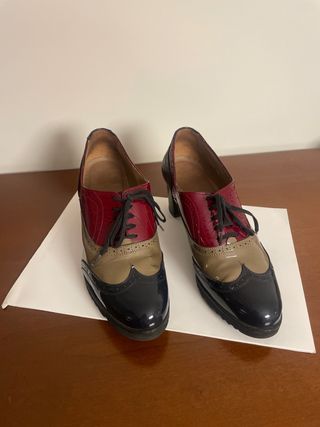 Zapatos tipo Oxford con acabado charol, casi nuevos. - Diseño de varios colores. - Cierre con cordones.