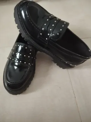 Estos zapatos negros son perfectos para niñas. Tienen un diseño moderno y elegante. Talla 34 - Acabado brillante. - Detalle de tachuelas plateadas. - Suela gruesa y resistente.