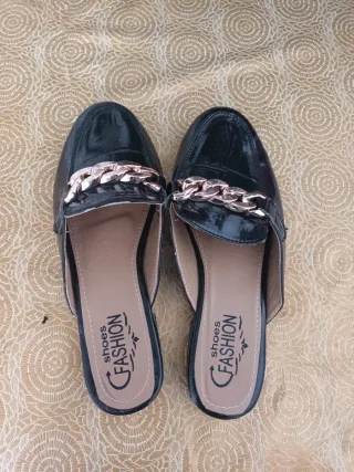 Mocasines negros de charol con detalle de cadena dorada. - Diseño destalonado. - Cadena metálica decorativa en la pala. - Suela con logo 'shoes FASHION'.