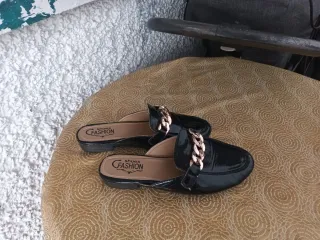 Elegantes mocasines de la marca Zara, perfectos para un look sofisticado. - Diseño clásico en color negro. - Detalle de cadena dorada en la pala. - Suela gruesa y cómoda.