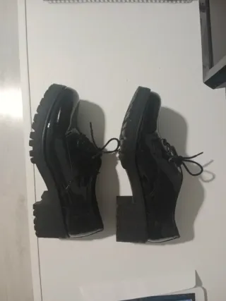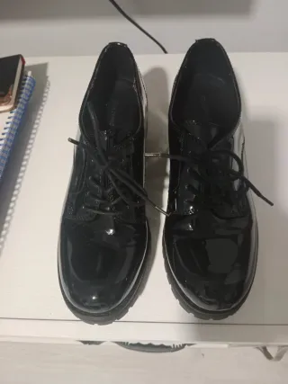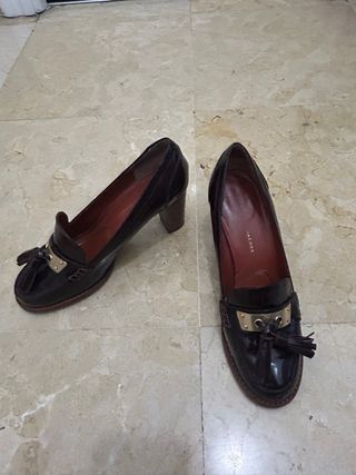 Zapatos negros, estilo formal tipo mocasines, de charol. Son muy cómodos. Tienen muy poco uso. Son un 38 de Mango ( pero tallan grandes)