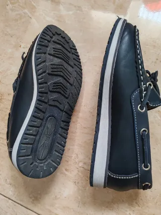 Conjunto de calzado infantil que incluye zapatos náuticos y zapatillas. - Zapatos náuticos de estilo casual. - Zapatillas deportivas de tela. - Cierre de cordones. Un par 10, los dos por 15 euros