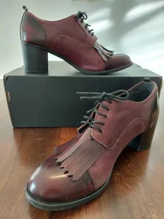 Elegantes mocasines en tono burdeos, con un diseño moderno y detalles de flecos y en puntera y tacón. Tacón grueso para mayor comodidad. Cierre de cordones. Talla 41 Marca made in Spain, exterior es piel. Están usados, pero cuidados. Si buscas algo especial, tengo más zapatos en mi armario, tacones y nuevos.