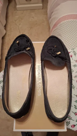 Mocasines de ante azul marino de Michael Kors. Un calzado elegante y cómodo. - Detalle de lazo con adornos dorados. - Logo de la marca en la plantilla. - Única propietario. - Excelente estado.