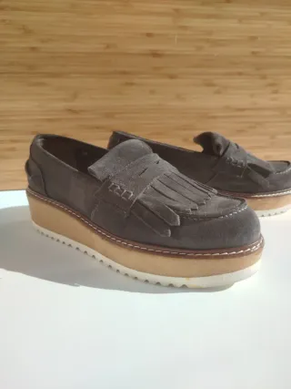 Mocasines de plataforma con un diseño moderno y elegante.Serrqje gris.No pesan nada en absoluto.Muy cómodos.Puestos solo una vez. - Material exterior de ante. - Detalle de flecos en la pala. - Suela gruesa de tocino con acabado de goma - Fabricados en Italia.