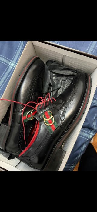 Elegantes zapatos de vestir con detalles distintivos. - Diseño tipo Oxford con perforaciones. - Cordones rojos. - Tira decorativa con logo y aros dorados. - Suela con borde rojo.