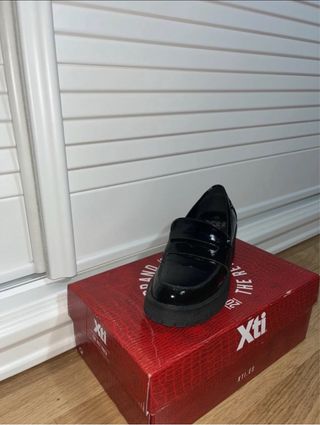 Preciosos mocasines de Pull Bear, talla 40, en color negro. Son de charol y tienen una plataforma gruesa. Ideales para darle un toque chic a cualquier look. - Diseño de mocasín clásico con detalle de hebilla. - Plataforma cómoda y resistente. - Material brillante y elegante.llevan plataforma y sin super cómodos me quedan algo pekeños Page 49€