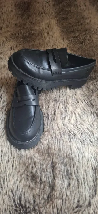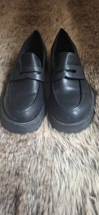 Mocasines negros de Stradivarius con suela gruesa. - Diseño de mocasín clásico ✨ -Talla 39 👣 - Estilo: clásico/elegantes 👠 - Suela de goma con plataforma ✨ -Muy buen estado✔️ Puestos en contadas ocasiones, no eran mucho mi estilo aunque quedan muy bien. Se entregarán limpios y desinfectados.
