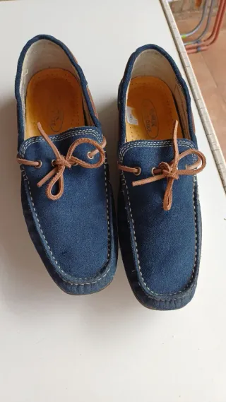 Mocasines náuticos de ante en color azul. - Cierre con cordones de cuero. - Detalle de pespuntes blancos. - Suela de goma. Son muy blandos. Tienen 2 puestas o 3 máximo
