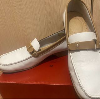 Mocasines elegantes en color blanco con detalles en beige. - Diseño clásico de mocasín. - Adorno metálico en la pala. - Ribete en contraste.