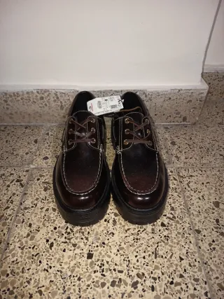 Mocasines de la marca Pull&Bear en color marrón. Precio original 45,99 - Diseño clásico. - Cordones marrones. - Suela gruesa.