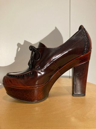 Mocasín con plataforma de Adolfo Domínguez de piel. Color granate destonificado. Tacón ancho de 11,5 cm. Perfecto para look de oficina. Usados solo una vez. En perfecto estado salvo algún roce imperceptible. Talla 39 (Talla pequeño. Yo uso 38 y me queda un poco holgado pero no grande)