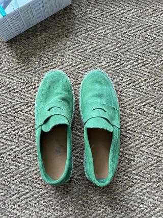 Mocasines de ante en color verde con suela de esparto. - Material exterior: Ante. - Detalle de pespuntes blancos. - Diseño tipo mocasín. Suela el esparto y goma
