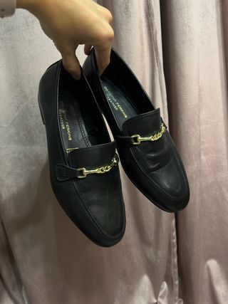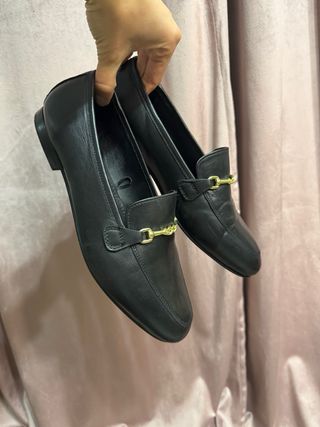 Mocasines negros de Zara con detalle de cadena dorada. - Diseño moderno y elegante. - Suela gruesa y cómoda. - Acabado en piel. Dimensiones: 27 cm de largo y 9 de ancho (interior). Tacón de 5 cm y plataforma de 3 cm.