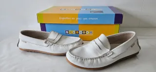 Mocasines de la marca Pablosky en color blanco. Son cómodos y elegantes. En perfecto estado, con un solo uso - Diseño clásico de mocasín. - Material exterior de piel. - Interior forrado para mayor confort. - Suela flexible.