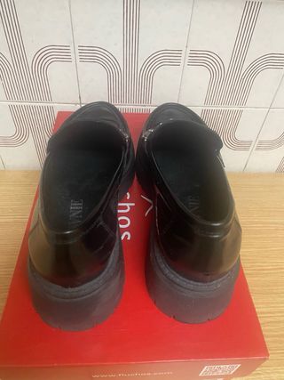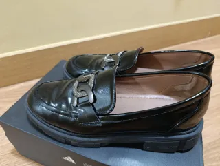 Zapatos tipo mocasín de charol . - Diseño brillante y elegante. - Suela gruesa y resistente. - Detalle de la marca en la lengüeta. Nuevos con etiqueta. Talla:36 Se envían , no me desplazo. No negociable