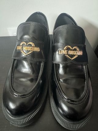 Mocasines de charol con detalle de corazón y logo. - Color negro. - Adorno metálico dorado. - Suela gruesa.
