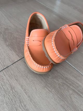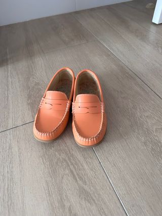 Mocasines de la marca Pablosky para niño en color naranja. - Diseño clásico. - Costuras decorativas. Talla 31 En perfecto estado, usados únicamente una vez en una boda. Son de piel.