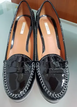Mocasines de charol auténtico, talla 36. Tiene en el empeine unas pequeñas arrugas de uso, y por lo demás en buen estado.