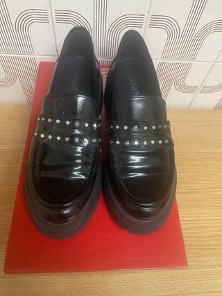 Mocasines negros de la marca Brownie con un diseño moderno y atrevido. - Acabado brillante. - Detalle de tachuelas plateadas. - Suela gruesa. - Son un 38. - Estan nuevos, solo se han usado una vez.