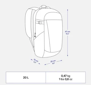 Mochila de senderismo con una capacidad de 20 litros. - Dimensiones: 47 cm (alto) x 25 cm (ancho) x 14 cm (profundidad). - Peso: 0,47 kg (1 lb 0,6 oz). - Precio Negociable.