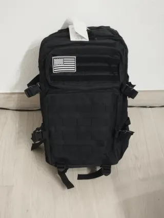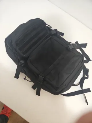 Mochila táctica de tela de color negro. Se encuentra sin estrenar. No sé cual es la capacidad exacta, pero no es muy grande. Estará entre los 20-26 Litros de capacidad. Ideal para el día a día, trabajo o ir al gimnasio.