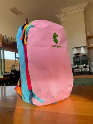 Mochila Cotopaxi de 20 litros con un diseño colorido y vibrante. - Compartimento principal espacioso. - Bolsillo frontal con cremallera. - Tirantes ajustables para mayor comodidad. - Asa superior para colgar.