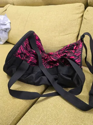 Bolsa de deporte Domyos con un diseño moderno y llamativo. - Capacidad de 20 litros. - Combinación de colores negro y rosa vibrante. - Estampado de animal print en la parte superior.
