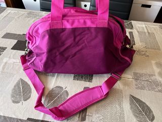 Bolso deportivo Nike en color rosa, para gimnasio o viajes cortos. Diseño moderno y práctico. - Compartimento principal con cierre. - Bolsillo frontal con cremallera. - Bolsillo pequeño frontal de tela por dentro como para el móvil y llaves. - Bolsillo lateral para zapatillas o chanclas. - Asas de mano y correa ajustable para hombro. - 20 litros En buen estado, solo le han caído los topes de abajo y las letras pero el logotipo se lee igualmente por el marcaje.
