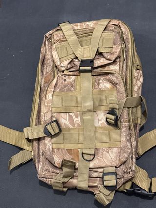 Mochila táctica de 30 litros, ideal para tus aventuras. - Color beige y marrón. - Diseño resistente y funcional. No de hacen envíos. Sólo entrega en mano.