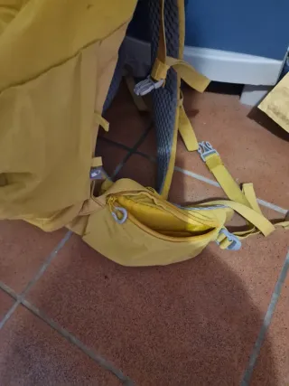 Mochila de senderismo de la marca Quechua ( Decathlon) - Capacidad de 20 litros. - Color amarillo vibrante. - Compartimento principal con cierre de cremallera. - Bolsillo frontal con cremallera. - Correas de hombro ajustables. - Asa superior para colgar. Funda lluvia incorporada 52 cms altura 30 de ancho 12 de base