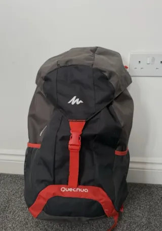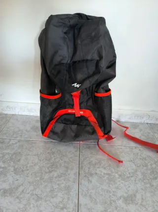 Mochila de senderismo Quechua con una capacidad de 40 litros. Ideal para excursiones y viajes. Impecable - Diseño en color negro y rojo. - Compartimento principal amplio. - Varios bolsillos exteriores para acceso rápido. - Correas de hombro y cinturón lumbar acolchados. -Impermeable acoplado en bolsillo inferior ideal días lluvia.