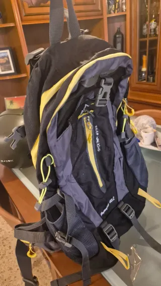 Bonita mochila Decathlon Cheyenne de 40 litros, poquísimo uso. Solo tiene una cremallera de un bolsillo que necesita 3 en 1, por estar tiempo en un maletero sin uso. Super precio!!!! - Diseño con múltiples bolsillos para organización. - Combinación de colores amarillo, gris y morado. - Correas anchas y soporte lumbar. - Cierre con hebillas y cordón ajustable. - Con cierres, asas y correas ajustables de seguridad - Impermeable, ideal para montañismo y actividades al aire libre
