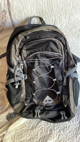 Mochila Forclaz de 40 litros. - Diseño en color negro y gris. - Cierre superior con cordón ajustable. - Bolsillo frontal con cremallera. - Correas de hombro acolchadas y ajustables. - Asa superior para colgar. Dos bolsillos laterales independientes. Bolsillo en la tapa. Acceso al compartimento interior desde la tapa frontal. Todas las cremalleras funcionan perfectamente y se deslizan con suavidad. La única pega que se le puede poner es que el bolsillo que aparece en la penúltima foto y se une con dos pequeños velcros a la correa de la cintura...no pega bien. El velcro no lo deja sujeto a la correa.