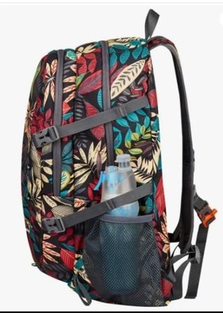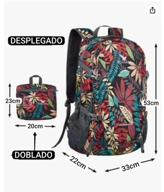 Mochila plegable marca POKARLA 40 litros. Versátil y práctica. Composición: nailon resistente, repelente de agua. Cremalleras fuertes. Cintas para ajustar contenido y asas regulables. Cierre en el pecho para llevar con más comodidad. Bolsillos laterales de rejilla. Es muy completa. ¡A ESTRENAR! La compré como mochila complementaria para un viaje, pero al final no la nesecité. Precio original Amazon: 26,70€ - Plegable para fácil almacenamiento. - Estampado floral vibrante. - Medidas desplegada: 55cm alto x 35cm ancho x 23cm profundidad. - Medidas plegada: 23cm alto x 20cm ancho. Para recoger en Plaza España-Argüelles o envío