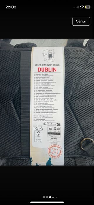 Mochila para debajo del asiento en el avión, tamaño 40cm X 20cm X 25 cm, 20 litros de capacidad Nueva, sin estrenar No negociable