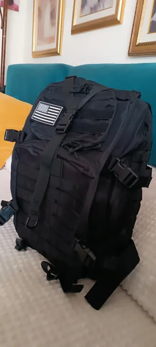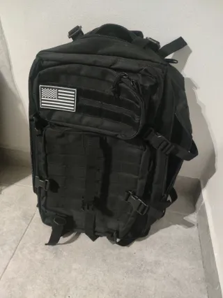 Mochila todoterreno de gran capacidad (50 litros)! 🎒 Vendo esta mochila táctica en color negro, ideal tanto para viajes largos como para entusiastas del fitness (estilo Crossfit), senderismo o camping. Es muy resistente y ofrece una organización excelente. Características principales: • Capacidad: 50L (espacio de sobra para ropa, calzado y equipo). • Sistema MOLLE: Panel frontal y lateral para colgar accesorios adicionales. • Diseño Ergonómico: Correas ajustables en hombros, pecho y cintura para mayor comodidad y reparto del peso. • Material: Tela de alta resistencia, repelente al agua. • Compartimentos: Varios bolsillos internos y