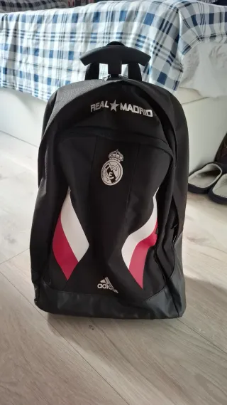 Maleta con diseño del Real Madrid y detalles en rosa. - Logo del Real Madrid. - Logo de Adidas. - Diseño con franjas rosas y blancas.