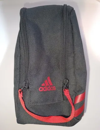Neceser de la marca Adidas con un diseño moderno y práctico. - Color principal negro con detalles en rojo. - Cierre de cremallera. - Asa de transporte. - Logo de Adidas en la parte frontal.