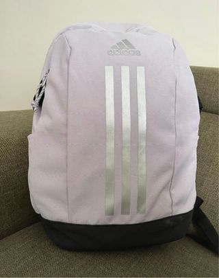 Mochila de la marca Adidas con un diseño moderno y práctico. - Color morado con detalles en negro. - Tres franjas plateadas reflectantes. - Bolsillo lateral.