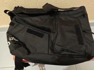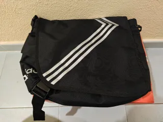 Bandolera Adidas en color negro con ribetes blancos. Los tiradores de las cremalleras tienen un aspecto un poco desgastado pero es meramente estético, funcionan perfectamente. También tiene una correa ajustable.