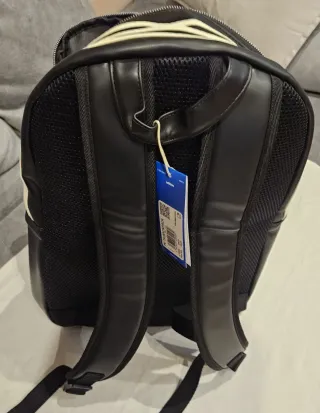 Mochila de cuero con un diseño bicolor. - Marca: Adidas original - Material: Cuero. - Combinación de colores: Negro y blanco. - Textura tipo piel de serpiente. Está en buenas condiciones, se puede usar perfectamente pero tiene algunos pequeños defectos (que se pueden arreglar fácilmente). Estos son: -Una cremallera lateral no se cierra (todas las demás bien) -Algunas costuras en el interior están descosidas, especialmente bolsillos. -En el exterior tiene alguna pequeña rotura y logo desgastado (como se ve en la foto)