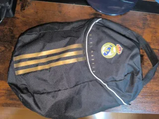 Mochila deportiva con el escudo del Real Madrid. Portaja objetos como neceser o botero para botas de fútbol - Diseño bicolor en blanco y negro. - Asa superior para colgar o transportar. - Base reforzada con detalles de rayas. - Nuevas a Estrenar con etiquetas. Hago envios