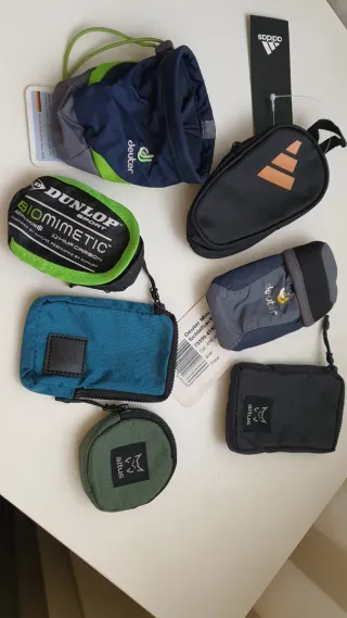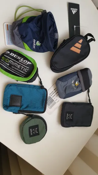 Lote de varios monederos de marcas deportivas. - Monedero Deuter azul y verde. - Monedero Dunlop biomimetic. - Monedero Adidas con detalle naranja. - Monedero Deuter pequeño gris. - Monedero Altus verde. - Monedero Altus gris.