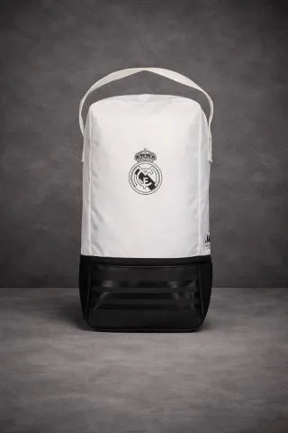 Mochila deportiva con el escudo del Real Madrid. Portaja objetos como neceser o botero para botas de fútbol - Diseño bicolor en blanco y negro. - Asa superior para colgar o transportar. - Base reforzada con detalles de rayas. - Nuevas a Estrenar con etiquetas. Original - Hago envios
