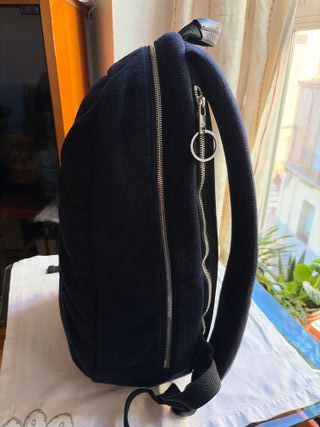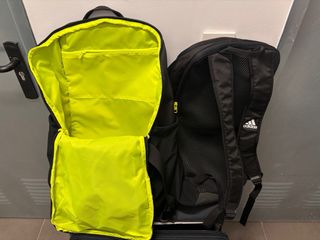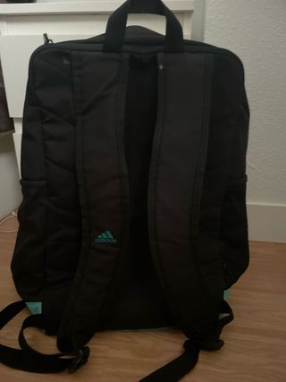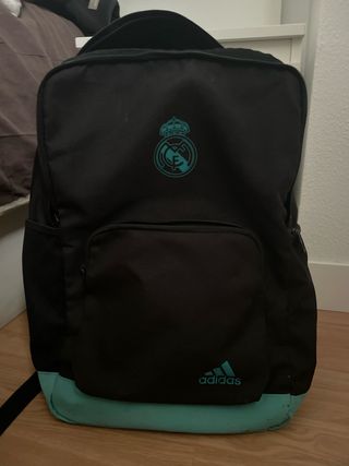 Mochila deportiva con el escudo del Real Madrid y el logo de Adidas. - Diseño en color negro con detalles en turquesa. - Compartimento principal amplio. - Bolsillo frontal con cremallera. Lo unico que tiene es lo que se ve en la ultima foto que llevaba el nombre del niño y se ha quedado un poco del pegamento pero casi no se nota,es en la parte trasera. Hago lotes