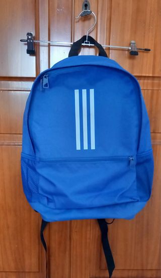Mochila azul de Adidas a estrenar. En el interior del compartimento grande hay 2 bolsillos, uno de ellos con cremallera. Cuenta en los laterales con 2 bolsillos de malla para meter botellas. Conserva la etiqueta original.