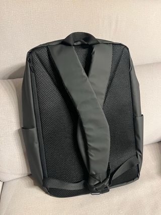 Mochila con un diseño moderno y llamativo en tres colores. Compartimento protegido para portátil Tiene un compartimento principal con cremallera. Otro frontal pequeño también con cremallera y dos laterales de malla En la espalda tiene uno de acceso lateral para portátil y cierre con cremallera. Buen estado - Compartimento principal con cierre. - Bolsillo frontal con cremallera. - Correas ajustables.