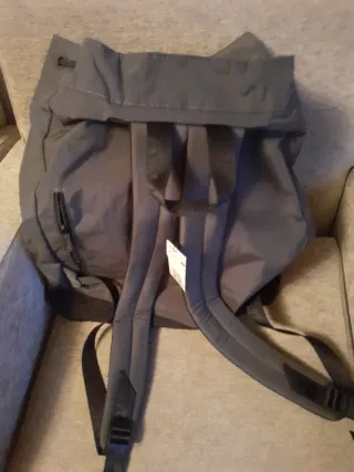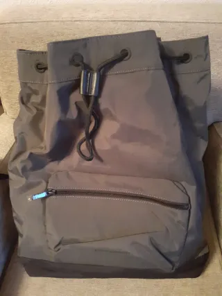 Mochila saco de Adolfo Dominguez en color gris. Diseño moderno y práctico. Nuevo a estrenar. Entrega en mano en Madrid. - Cierre con cordón. - Bolsillo exterior con cremallera. - Base reforzada.